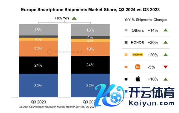 欧洲阛阓上,销售额前五的手机厂商辞别为:三星、苹果、小米、realme真我、荣耀;