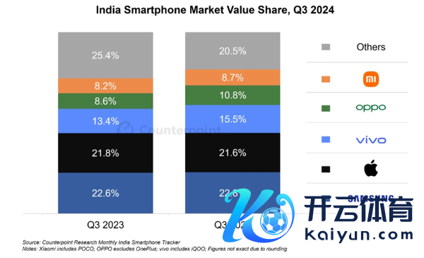 印度阛阓上,销售额前五的手机厂商辞别为:三星、苹果、OPPO、vivo、小米;
