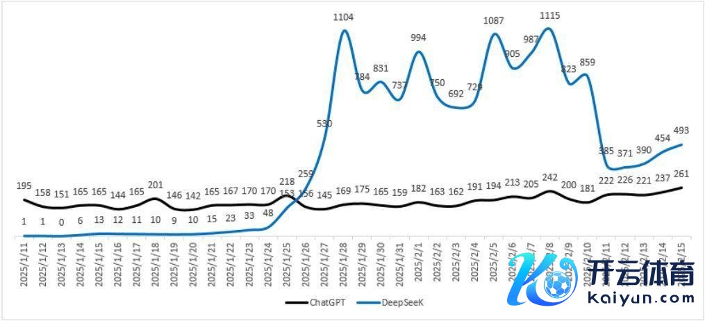 图1:ChatGPT与DeepSeeK逐日APP端下载量走势图(单元:万次)