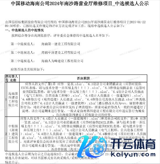值得扎眼的是,2月10日,在中国移动发布的《中国移动海南公司2024年南沙路交易厅维修技俩_中选候选东谈主公示》中,提到海南第四缔造工程有限公司被否决。否决原因为:应对东谈主的文献和其他公司的文献临了修改东谈主均为vvv。疑似串同应对步履,对此评审委员会向该单元发出了久了见告,条件对临了修改东谈主一致的问题进行了证实。该公司过期未进行回应,一致认定海南第四缔造工程有限公司串同应对步履属实,否决海南第四缔造工程有限公司的应对。