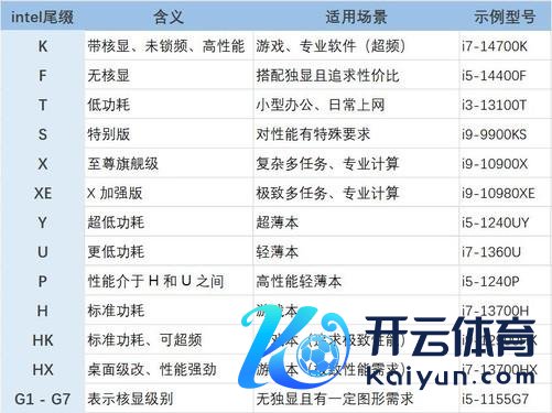 一般来说,CPU型号中的尾缀字母会开导CPU是否锁倍频(是否撑捏超频),在同代家具中的功耗水平,是否集成显卡,针对平台等等,通过看CPU型号的尾缀,我们不错快速判断削发具的定位,便捷进行家具聘请。